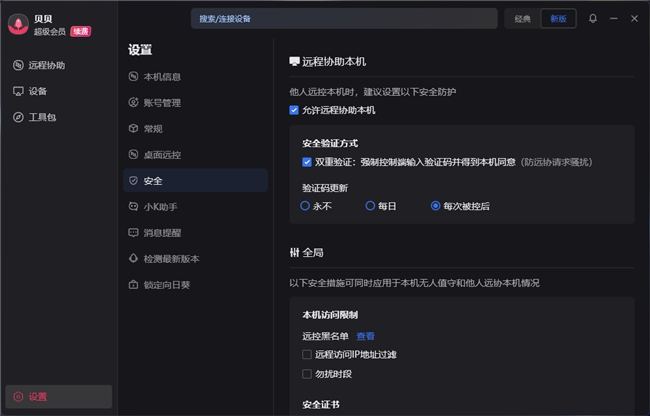 我们可以在设置选项中开启“双重验证访问”功能,开启后每次通过识别码发起的远程协助都需要经过您的同意,即使对方拥有您设备的远控验证码也一样。