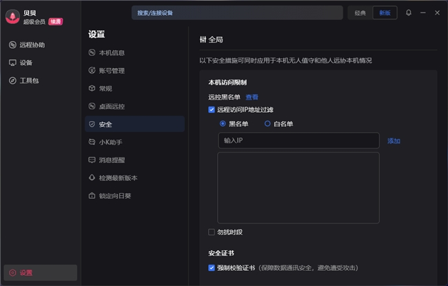 我们可以设置IP地址黑名单,或者直接禁用识别码远控,防止陌生人获知您的识别码之后向您频繁发起远控请求,从而做到防止骚扰。