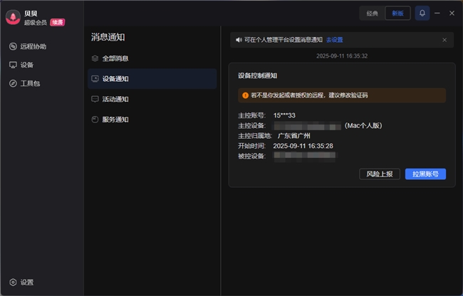 我们可以查看远程控制和文件传输等操作的详细记录,这些记录也可以通过上文提到过的通知功能,发送至您的向日葵软件端和绑定的微信,并支持拉黑对方账号以及风险上报。
