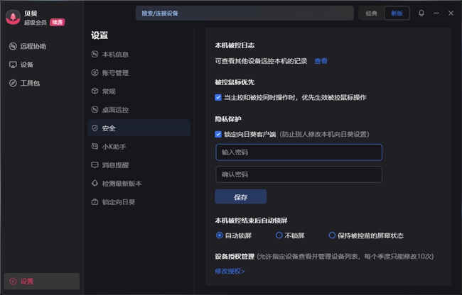 当我们正在对远端自己的设备进行远程控制时,向日葵同样搭载了确保我们信息隐私安全的功能: